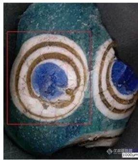 可以看出Na2O、SiO2和CaO的含量较高,是该蜻蜓眼珠主要组成成分;MgO和K2O含量则低于1%,可以推断该玻璃属于西方埃及或东地中海沿岸典型的泡碱型钠钙硅酸盐玻璃
